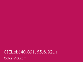 CIELab 40.891,65,6.921 Color is a normal rose color and the nearest color is Pictorial Carmine #c30b4e. Hex code #bc1158 and RGB value is rgb(188,17,88). In RGB color space, this color is composed of 74% red, 7% green, 35% blue, In CMYK color space, this color is composed of 0% cyan, 91% magenta, 53% yellow , 26% black , In HSL color space, this color has a hue angle of 335° , 83% saturation and 40% lightness.