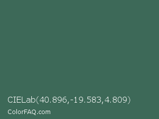 CIELab 40.896,-19.583,4.809 Color is a normal green color and the nearest color is Mineral Green #3f5d53. Hex code #3d6958 and RGB value is rgb(61,105,88). In RGB color space, this color is composed of 24% red, 41% green, 35% blue, In CMYK color space, this color is composed of 42% cyan, 0% magenta, 16% yellow , 59% black , In HSL color space, this color has a hue angle of 157° , 27% saturation and 33% lightness.