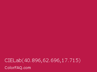 CIELab 40.896,62.696,17.715 Color is a normal rose color and the nearest color is Maroon Flush #c32148. Hex code #bc1847 and RGB value is rgb(188,24,71). In RGB color space, this color is composed of 74% red, 9% green, 28% blue, In CMYK color space, this color is composed of 0% cyan, 87% magenta, 62% yellow , 26% black , In HSL color space, this color has a hue angle of 343° , 77% saturation and 42% lightness.