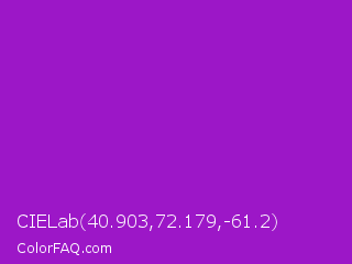 CIELab 40.903,72.179,-61.2 Color is a normal purple color and the nearest color is Purple Munsell #9f00c5. Hex code #9c17c7 and RGB value is rgb(156,23,199). In RGB color space, this color is composed of 61% red, 9% green, 78% blue, In CMYK color space, this color is composed of 22% cyan, 88% magenta, 0% yellow , 22% black , In HSL color space, this color has a hue angle of 285° , 79% saturation and 44% lightness.