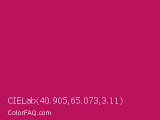 CIELab 40.905,65.073,3.11 Color is a normal rose color and the nearest color is Rose Red #c21e56. Hex code #bb125e and RGB value is rgb(187,18,94). In RGB color space, this color is composed of 73% red, 7% green, 37% blue, In CMYK color space, this color is composed of 0% cyan, 90% magenta, 50% yellow , 27% black , In HSL color space, this color has a hue angle of 333° , 82% saturation and 40% lightness.