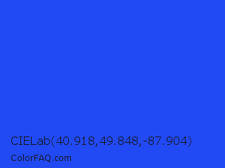 CIELab 40.918,49.848,-87.904 Color is a normal blue color and the nearest color is Palatinate Blue #273be2. Hex code #214af5 and RGB value is rgb(33,74,245). In RGB color space, this color is composed of 13% red, 29% green, 96% blue, In CMYK color space, this color is composed of 87% cyan, 70% magenta, 0% yellow , 4% black , In HSL color space, this color has a hue angle of 228° , 91% saturation and 55% lightness.