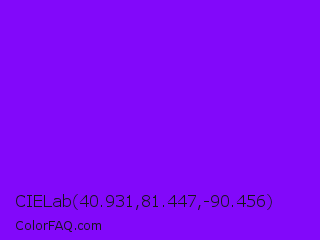 CIELab 40.931,81.447,-90.456 Color is a normal violet color and the nearest color is Violet Color Wheel #7f00ff. Hex code #8208fa and RGB value is rgb(130,8,250). In RGB color space, this color is composed of 51% red, 3% green, 98% blue, In CMYK color space, this color is composed of 48% cyan, 97% magenta, 0% yellow , 2% black , In HSL color space, this color has a hue angle of 270° , 96% saturation and 51% lightness.