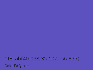 CIELab 40.938,35.107,-56.835 Color is a normal indigo color and the nearest color is Blue Violet #6456b7. Hex code #5d50bf and RGB value is rgb(93,80,191). In RGB color space, this color is composed of 36% red, 31% green, 75% blue, In CMYK color space, this color is composed of 51% cyan, 58% magenta, 0% yellow , 25% black , In HSL color space, this color has a hue angle of 247° , 46% saturation and 53% lightness.