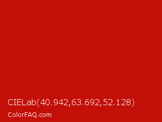 CIELab 40.942,63.692,52.128 Color is a normal red color and the nearest color is Milano Red #b81104. Hex code #c20f08 and RGB value is rgb(194,15,8). In RGB color space, this color is composed of 76% red, 6% green, 3% blue, In CMYK color space, this color is composed of 0% cyan, 92% magenta, 96% yellow , 24% black , In HSL color space, this color has a hue angle of 2° , 92% saturation and 40% lightness.