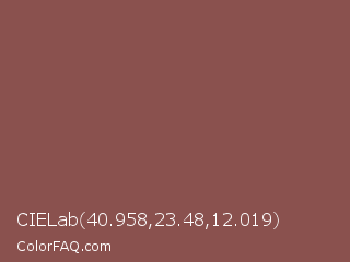 CIELab 40.958,23.48,12.019 Color is a normal red color and the nearest color is Spicy Mix #885342. Hex code #8a514e and RGB value is rgb(138,81,78). In RGB color space, this color is composed of 54% red, 32% green, 31% blue, In CMYK color space, this color is composed of 0% cyan, 41% magenta, 43% yellow , 46% black , In HSL color space, this color has a hue angle of 3° , 28% saturation and 42% lightness.