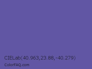 CIELab 40.963,23.88,-40.279 Color is a normal indigo color and the nearest color is Scampi #675fa6. Hex code #6156a3 and RGB value is rgb(97,86,163). In RGB color space, this color is composed of 38% red, 34% green, 64% blue, In CMYK color space, this color is composed of 40% cyan, 47% magenta, 0% yellow , 36% black , In HSL color space, this color has a hue angle of 249° , 31% saturation and 49% lightness.