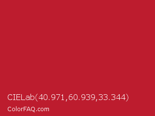 CIELab 40.971,60.939,33.344 Color is a normal red color and the nearest color is Cardinal #c41e3a. Hex code #bd1c2e and RGB value is rgb(189,28,46). In RGB color space, this color is composed of 74% red, 11% green, 18% blue, In CMYK color space, this color is composed of 0% cyan, 85% magenta, 76% yellow , 26% black , In HSL color space, this color has a hue angle of 353° , 74% saturation and 43% lightness.