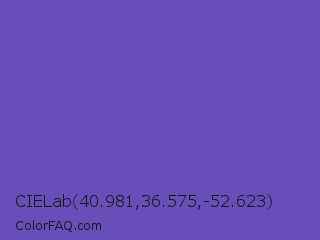 CIELab 40.981,36.575,-52.623 Color is a normal indigo color and the nearest color is Blue Violet #6456b7. Hex code #684eb8 and RGB value is rgb(104,78,184). In RGB color space, this color is composed of 41% red, 31% green, 72% blue, In CMYK color space, this color is composed of 43% cyan, 58% magenta, 0% yellow , 28% black , In HSL color space, this color has a hue angle of 255° , 43% saturation and 51% lightness.