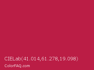CIELab 41.014,61.278,19.098 Color is a normal red color and the nearest color is Maroon Flush #c32148. Hex code #bb1d45 and RGB value is rgb(187,29,69). In RGB color space, this color is composed of 73% red, 11% green, 27% blue, In CMYK color space, this color is composed of 0% cyan, 84% magenta, 63% yellow , 27% black , In HSL color space, this color has a hue angle of 345° , 73% saturation and 42% lightness.