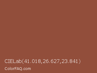 CIELab 41.018,26.627,23.841 Color is a normal red color and the nearest color is Potters Clay #8c5738. Hex code #924e3b and RGB value is rgb(146,78,59). In RGB color space, this color is composed of 57% red, 31% green, 23% blue, In CMYK color space, this color is composed of 0% cyan, 47% magenta, 60% yellow , 43% black , In HSL color space, this color has a hue angle of 13° , 42% saturation and 40% lightness.