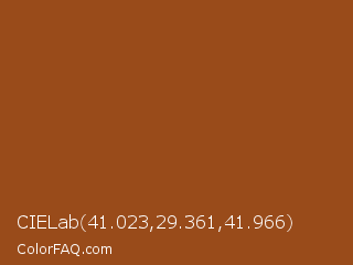 CIELab 41.023,29.361,41.966 Color is a normal orange color and the nearest color is Rope #8e4d1e. Hex code #994b1a and RGB value is rgb(153,75,26). In RGB color space, this color is composed of 60% red, 29% green, 10% blue, In CMYK color space, this color is composed of 0% cyan, 51% magenta, 83% yellow , 40% black , In HSL color space, this color has a hue angle of 23° , 71% saturation and 35% lightness.