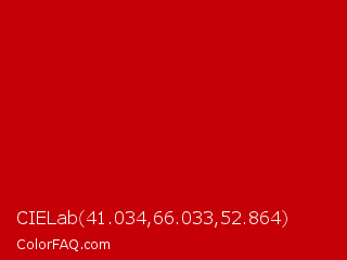 CIELab 41.034,66.033,52.864 Color is a normal red color and the nearest color is Boston University Red #cc0000. Hex code #c50007 and RGB value is rgb(197,0,7). In RGB color space, this color is composed of 77% red, 0% green, 3% blue, In CMYK color space, this color is composed of 0% cyan, 100% magenta, 96% yellow , 23% black , In HSL color space, this color has a hue angle of 358° , 100% saturation and 39% lightness.