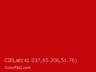 CIELab 41.037,65.206,51.76 Color is a normal red color and the nearest color is Venetian Red #c80815. Hex code #c4060a and RGB value is rgb(196,6,10). In RGB color space, this color is composed of 77% red, 2% green, 4% blue, In CMYK color space, this color is composed of 0% cyan, 97% magenta, 95% yellow , 23% black , In HSL color space, this color has a hue angle of 359° , 94% saturation and 40% lightness.