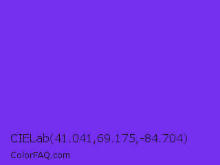 CIELab 41.041,69.175,-84.704 Color is a normal violet color and the nearest color is Blue Violet #8a2be2. Hex code #732ef0 and RGB value is rgb(115,46,240). In RGB color space, this color is composed of 45% red, 18% green, 94% blue, In CMYK color space, this color is composed of 52% cyan, 81% magenta, 0% yellow , 6% black , In HSL color space, this color has a hue angle of 261° , 87% saturation and 56% lightness.