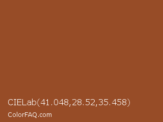 CIELab 41.048,28.52,35.458 Color is a normal orange color and the nearest color is Cumin #924321. Hex code #974c27 and RGB value is rgb(151,76,39). In RGB color space, this color is composed of 59% red, 30% green, 15% blue, In CMYK color space, this color is composed of 0% cyan, 50% magenta, 74% yellow , 41% black , In HSL color space, this color has a hue angle of 20° , 59% saturation and 37% lightness.