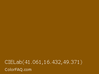 CIELab 41.061,16.432,49.371 Color is a dark orange color and the nearest color is Rusty Nail #86560a. Hex code #8a5501 and RGB value is rgb(138,85,1). In RGB color space, this color is composed of 54% red, 33% green, 0% blue, In CMYK color space, this color is composed of 0% cyan, 38% magenta, 99% yellow , 46% black , In HSL color space, this color has a hue angle of 37° , 99% saturation and 27% lightness.