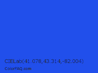 CIELab 41.078,43.314,-82.004 Color is a normal blue color and the nearest color is Palatinate Blue #273be2. Hex code #214feb and RGB value is rgb(33,79,235). In RGB color space, this color is composed of 13% red, 31% green, 92% blue, In CMYK color space, this color is composed of 86% cyan, 66% magenta, 0% yellow , 8% black , In HSL color space, this color has a hue angle of 226° , 83% saturation and 53% lightness.
