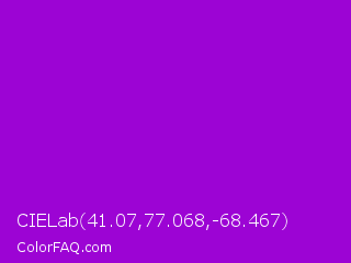 CIELab 41.07,77.068,-68.467 Color is a normal purple color and the nearest color is Dark Violet #9400d3. Hex code #9c04d4 and RGB value is rgb(156,4,212). In RGB color space, this color is composed of 61% red, 2% green, 83% blue, In CMYK color space, this color is composed of 26% cyan, 98% magenta, 0% yellow , 17% black , In HSL color space, this color has a hue angle of 284° , 96% saturation and 42% lightness.