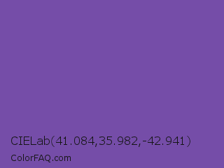 CIELab 41.084,35.982,-42.941 Color is a normal violet color and the nearest color is Royal Purple #7851a9. Hex code #754da8 and RGB value is rgb(117,77,168). In RGB color space, this color is composed of 46% red, 30% green, 66% blue, In CMYK color space, this color is composed of 30% cyan, 54% magenta, 0% yellow , 34% black , In HSL color space, this color has a hue angle of 266° , 37% saturation and 48% lightness.
