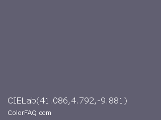 CIELab 41.086,4.792,-9.881 Color is a normal indigo color and the nearest color is Mid Gray #5f5f6e. Hex code #615f71 and RGB value is rgb(97,95,113). In RGB color space, this color is composed of 38% red, 37% green, 44% blue, In CMYK color space, this color is composed of 14% cyan, 16% magenta, 0% yellow , 56% black , In HSL color space, this color has a hue angle of 247° , 9% saturation and 41% lightness.