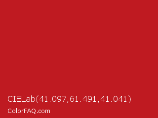 CIELab 41.097,61.491,41.041 Color is a normal red color and the nearest color is Carnelian #b31b1b. Hex code #bf1a21 and RGB value is rgb(191,26,33). In RGB color space, this color is composed of 75% red, 10% green, 13% blue, In CMYK color space, this color is composed of 0% cyan, 86% magenta, 83% yellow , 25% black , In HSL color space, this color has a hue angle of 357° , 76% saturation and 43% lightness.