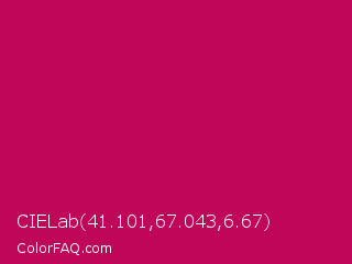 CIELab 41.101,67.043,6.67 Color is a normal rose color and the nearest color is Pictorial Carmine #c30b4e. Hex code #bf0659 and RGB value is rgb(191,6,89). In RGB color space, this color is composed of 75% red, 2% green, 35% blue, In CMYK color space, this color is composed of 0% cyan, 97% magenta, 53% yellow , 25% black , In HSL color space, this color has a hue angle of 333° , 94% saturation and 39% lightness.