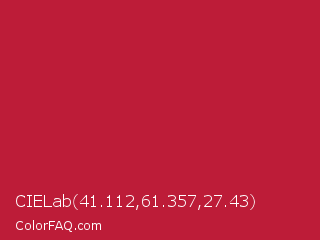 CIELab 41.112,61.357,27.43 Color is a normal red color and the nearest color is Cardinal #c41e3a. Hex code #bd1c38 and RGB value is rgb(189,28,56). In RGB color space, this color is composed of 74% red, 11% green, 22% blue, In CMYK color space, this color is composed of 0% cyan, 85% magenta, 70% yellow , 26% black , In HSL color space, this color has a hue angle of 350° , 74% saturation and 43% lightness.