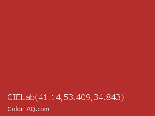CIELab 41.14,53.409,34.843 Color is a normal red color and the nearest color is Tall Poppy #b32d29. Hex code #b52e2b and RGB value is rgb(181,46,43). In RGB color space, this color is composed of 71% red, 18% green, 17% blue, In CMYK color space, this color is composed of 0% cyan, 75% magenta, 76% yellow , 29% black , In HSL color space, this color has a hue angle of 1° , 62% saturation and 44% lightness.