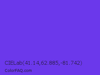 CIELab 41.14,62.885,-81.742 Color is a normal indigo color and the nearest color is Majorelle Blue #6050dc. Hex code #6b38eb and RGB value is rgb(107,56,235). In RGB color space, this color is composed of 42% red, 22% green, 92% blue, In CMYK color space, this color is composed of 54% cyan, 76% magenta, 0% yellow , 8% black , In HSL color space, this color has a hue angle of 257° , 82% saturation and 57% lightness.