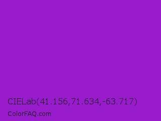 CIELab 41.156,71.634,-63.717 Color is a normal purple color and the nearest color is Dark Orchid #9932cc. Hex code #991ccc and RGB value is rgb(153,28,204). In RGB color space, this color is composed of 60% red, 11% green, 80% blue, In CMYK color space, this color is composed of 25% cyan, 86% magenta, 0% yellow , 20% black , In HSL color space, this color has a hue angle of 283° , 76% saturation and 45% lightness.