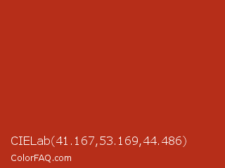 CIELab 41.167,53.169,44.486 Color is a normal red color and the nearest color is Thunderbird #c02b18. Hex code #b62e19 and RGB value is rgb(182,46,25). In RGB color space, this color is composed of 71% red, 18% green, 10% blue, In CMYK color space, this color is composed of 0% cyan, 75% magenta, 86% yellow , 29% black , In HSL color space, this color has a hue angle of 8° , 76% saturation and 41% lightness.