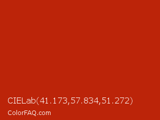 CIELab 41.173,57.834,51.272 Color is a normal red color and the nearest color is International Orange Engineering #ba160c. Hex code #bc2409 and RGB value is rgb(188,36,9). In RGB color space, this color is composed of 74% red, 14% green, 4% blue, In CMYK color space, this color is composed of 0% cyan, 81% magenta, 95% yellow , 26% black , In HSL color space, this color has a hue angle of 9° , 91% saturation and 39% lightness.