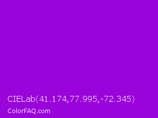 CIELab 41.174,77.995,-72.345 Color is a normal purple color and the nearest color is Dark Violet #9400d3. Hex code #9904db and RGB value is rgb(153,4,219). In RGB color space, this color is composed of 60% red, 2% green, 86% blue, In CMYK color space, this color is composed of 30% cyan, 98% magenta, 0% yellow , 14% black , In HSL color space, this color has a hue angle of 282° , 96% saturation and 44% lightness.