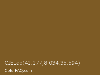 CIELab 41.177,8.034,35.594 Color is a normal orange color and the nearest color is Kumera #886221. Hex code #7d5b25 and RGB value is rgb(125,91,37). In RGB color space, this color is composed of 49% red, 36% green, 15% blue, In CMYK color space, this color is composed of 0% cyan, 27% magenta, 70% yellow , 51% black , In HSL color space, this color has a hue angle of 37° , 54% saturation and 32% lightness.