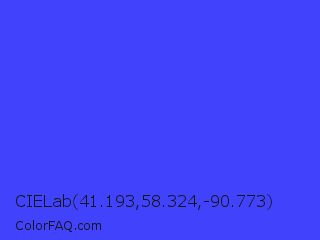 CIELab 41.193,58.324,-90.773 Color is a light blue color and the nearest color is Ultramarine Blue #4166f5. Hex code #4142fb and RGB value is rgb(65,66,251). In RGB color space, this color is composed of 25% red, 26% green, 98% blue, In CMYK color space, this color is composed of 74% cyan, 74% magenta, 0% yellow , 2% black , In HSL color space, this color has a hue angle of 240° , 96% saturation and 62% lightness.