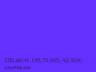 CIELab 41.195,70.605,-92.929 Color is a normal indigo color and the nearest color is Han Purple #5218fa. Hex code #6330ff and RGB value is rgb(99,48,255). In RGB color space, this color is composed of 39% red, 19% green, 100% blue, In CMYK color space, this color is composed of 61% cyan, 81% magenta, 0% yellow , 0% black , In HSL color space, this color has a hue angle of 255° , 100% saturation and 59% lightness.