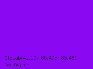 CIELab 41.197,80.495,-85.48 Color is a normal purple color and the nearest color is Electric Violet #8b00ff. Hex code #8a08f2 and RGB value is rgb(138,8,242). In RGB color space, this color is composed of 54% red, 3% green, 95% blue, In CMYK color space, this color is composed of 43% cyan, 97% magenta, 0% yellow , 5% black , In HSL color space, this color has a hue angle of 273° , 94% saturation and 49% lightness.