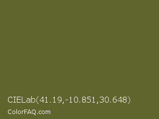 CIELab 41.19,-10.851,30.648 Color is a dark yellow color and the nearest color is Costa Del Sol #615d30. Hex code #60652d and RGB value is rgb(96,101,45). In RGB color space, this color is composed of 38% red, 40% green, 18% blue, In CMYK color space, this color is composed of 5% cyan, 0% magenta, 55% yellow , 60% black , In HSL color space, this color has a hue angle of 65° , 38% saturation and 29% lightness.