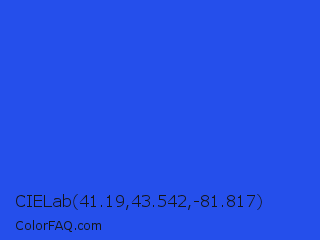 CIELab 41.19,43.542,-81.817 Color is a normal blue color and the nearest color is Palatinate Blue #273be2. Hex code #254feb and RGB value is rgb(37,79,235). In RGB color space, this color is composed of 15% red, 31% green, 92% blue, In CMYK color space, this color is composed of 84% cyan, 66% magenta, 0% yellow , 8% black , In HSL color space, this color has a hue angle of 227° , 83% saturation and 53% lightness.