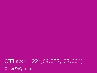 CIELab 41.224,69.377,-27.664 Color is a normal magenta color and the nearest color is Red Violet #c71585. Hex code #b40d90 and RGB value is rgb(180,13,144). In RGB color space, this color is composed of 71% red, 5% green, 56% blue, In CMYK color space, this color is composed of 0% cyan, 93% magenta, 20% yellow , 29% black , In HSL color space, this color has a hue angle of 313° , 87% saturation and 38% lightness.