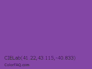 CIELab 41.22,43.115,-40.833 Color is a normal purple color and the nearest color is Royal Purple #7851a9. Hex code #8446a5 and RGB value is rgb(132,70,165). In RGB color space, this color is composed of 52% red, 27% green, 65% blue, In CMYK color space, this color is composed of 20% cyan, 58% magenta, 0% yellow , 35% black , In HSL color space, this color has a hue angle of 279° , 40% saturation and 46% lightness.