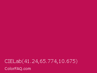CIELab 41.24,65.774,10.675 Color is a normal rose color and the nearest color is Pictorial Carmine #c30b4e. Hex code #bf0e53 and RGB value is rgb(191,14,83). In RGB color space, this color is composed of 75% red, 5% green, 33% blue, In CMYK color space, this color is composed of 0% cyan, 93% magenta, 57% yellow , 25% black , In HSL color space, this color has a hue angle of 337° , 86% saturation and 40% lightness.