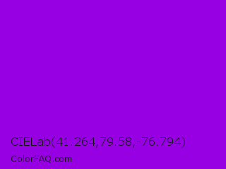 CIELab 41.264,79.58,-76.794 Color is a normal purple color and the nearest color is Dark Violet #9400d3. Hex code #9600e3 and RGB value is rgb(150,0,227). In RGB color space, this color is composed of 59% red, 0% green, 89% blue, In CMYK color space, this color is composed of 34% cyan, 100% magenta, 0% yellow , 11% black , In HSL color space, this color has a hue angle of 280° , 100% saturation and 45% lightness.