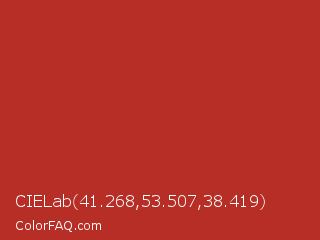 CIELab 41.268,53.507,38.419 Color is a normal red color and the nearest color is Tall Poppy #b32d29. Hex code #b62e25 and RGB value is rgb(182,46,37). In RGB color space, this color is composed of 71% red, 18% green, 15% blue, In CMYK color space, this color is composed of 0% cyan, 75% magenta, 80% yellow , 29% black , In HSL color space, this color has a hue angle of 4° , 66% saturation and 43% lightness.