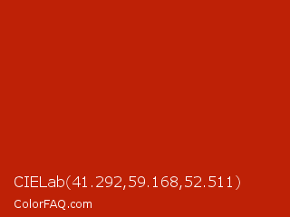 CIELab 41.292,59.168,52.511 Color is a normal red color and the nearest color is International Orange Engineering #ba160c. Hex code #be2106 and RGB value is rgb(190,33,6). In RGB color space, this color is composed of 75% red, 13% green, 2% blue, In CMYK color space, this color is composed of 0% cyan, 83% magenta, 97% yellow , 25% black , In HSL color space, this color has a hue angle of 9° , 94% saturation and 38% lightness.