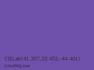 CIELab 41.307,33.452,-44.401 Color is a normal indigo color and the nearest color is Royal Purple #7851a9. Hex code #6f50ab and RGB value is rgb(111,80,171). In RGB color space, this color is composed of 44% red, 31% green, 67% blue, In CMYK color space, this color is composed of 35% cyan, 53% magenta, 0% yellow , 33% black , In HSL color space, this color has a hue angle of 260° , 36% saturation and 49% lightness.