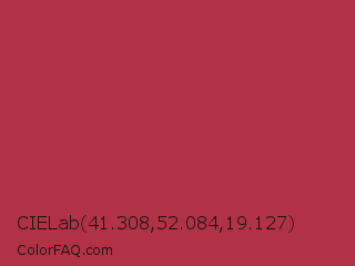 CIELab 41.308,52.084,19.127 Color is a normal red color and the nearest color is Amaranth Purple #ab274f. Hex code #b13245 and RGB value is rgb(177,50,69). In RGB color space, this color is composed of 69% red, 20% green, 27% blue, In CMYK color space, this color is composed of 0% cyan, 72% magenta, 61% yellow , 31% black , In HSL color space, this color has a hue angle of 351° , 56% saturation and 45% lightness.