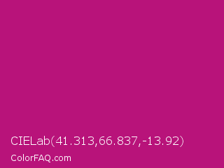 CIELab 41.313,66.837,-13.92 Color is a normal magenta color and the nearest color is Red Violet #c71585. Hex code #b8137a and RGB value is rgb(184,19,122). In RGB color space, this color is composed of 72% red, 7% green, 48% blue, In CMYK color space, this color is composed of 0% cyan, 90% magenta, 34% yellow , 28% black , In HSL color space, this color has a hue angle of 323° , 81% saturation and 40% lightness.
