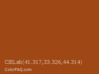 CIELab 41.317,33.326,44.314 Color is a normal orange color and the nearest color is Hawaiian Tan #9d5616. Hex code #9f4816 and RGB value is rgb(159,72,22). In RGB color space, this color is composed of 62% red, 28% green, 9% blue, In CMYK color space, this color is composed of 0% cyan, 55% magenta, 86% yellow , 38% black , In HSL color space, this color has a hue angle of 22° , 76% saturation and 35% lightness.